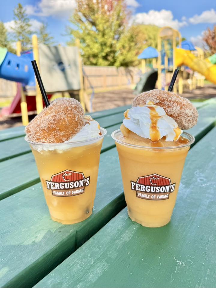 One of the highlights for us was trying the Ferguson Apple Cider slushies. We sampled both the alcoholic and non-alcoholic versions, and both were delicious. What made them even better was the presentation—the fluffy whipped cream and an apple cider doughnut perched on top transformed the drinks into something truly special. They were as fun to look at as they were to sip.