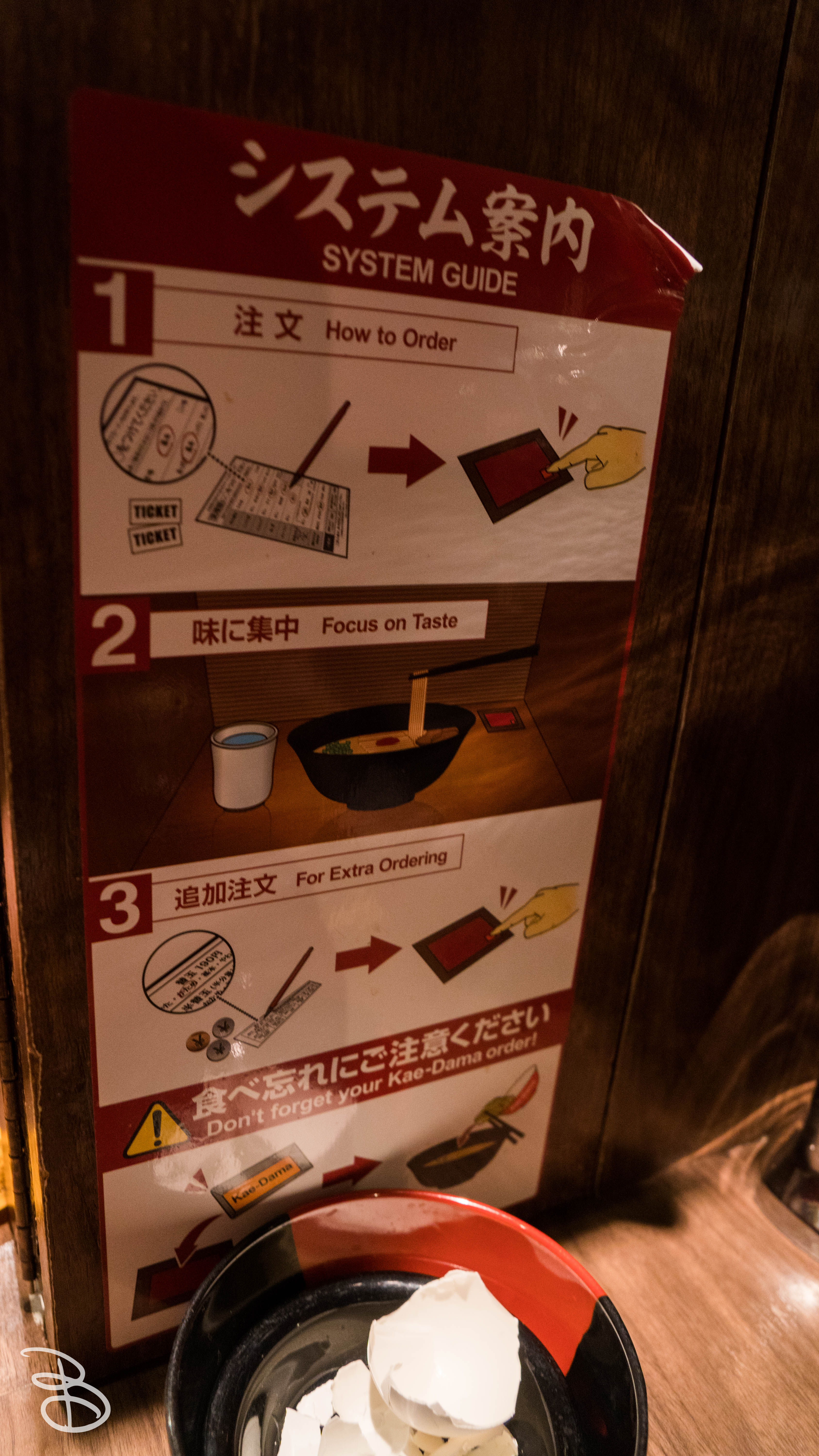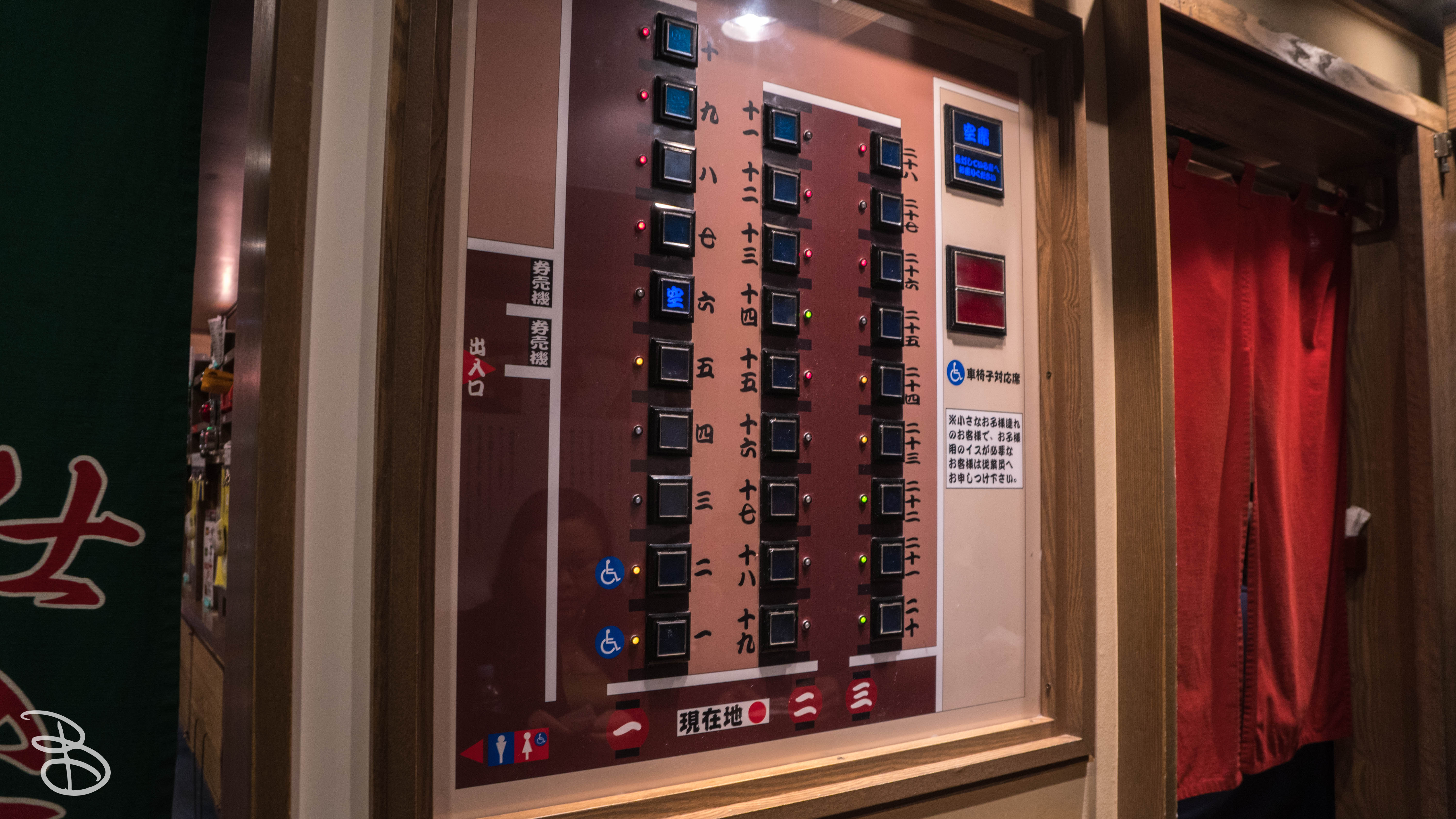 The location we went to was the one located in Shinjuku, a few blocks east of Shinjuku Station. When we arrived there was already a line up and out to the sidewalk. The experience itself was interesting. When you get down to the entrance, you go up to a ticket machine where you put in your money that spits out your meal tickets. Then after being seated at a booth, you give these tickets to the person on the other side of the curtain. You don’t actually see the person on the other side of the curtain, so it’s just you, yourself, and the bowl of ramen.