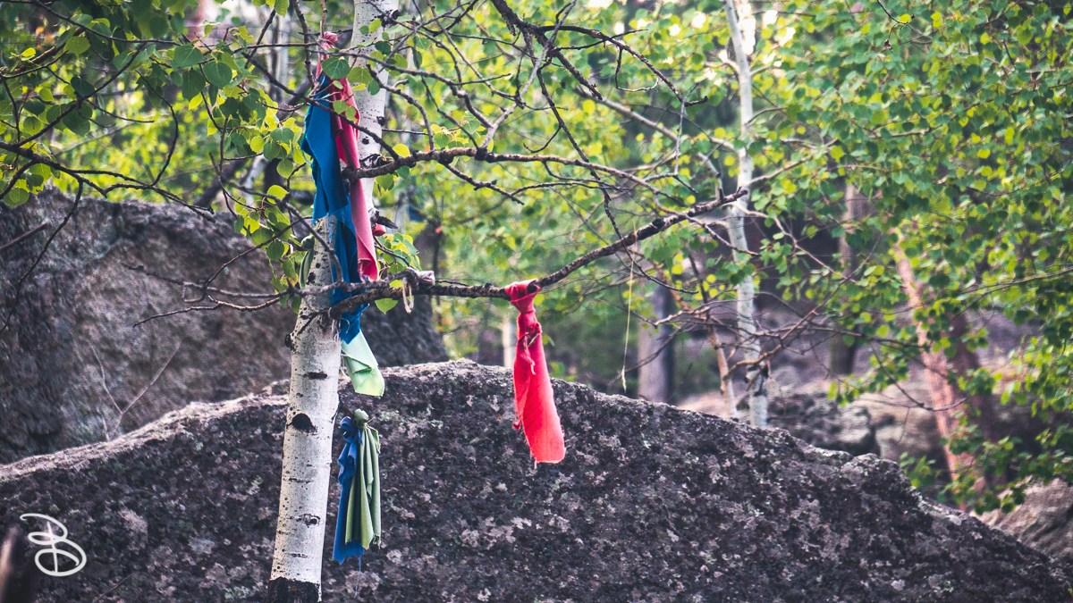 - There were cloth bundles that were tied around the trees while we were walking on the trail to get a good view of the towering structure. These cloth bundles, as we came to learn more about them, were actually prayer bundles and cloths usually left by Native Americans.